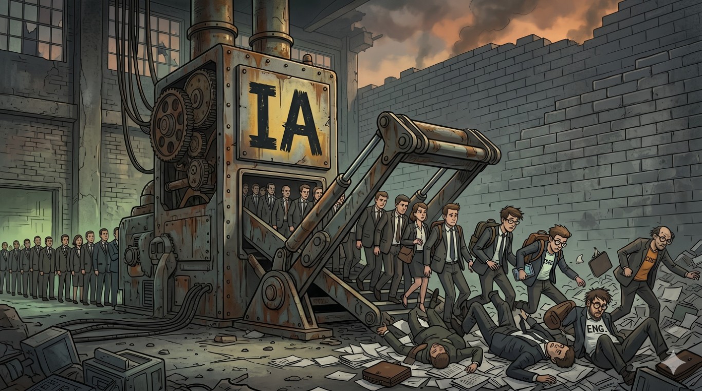 É o equivalente a uma fábrica de automóveis despedir os operários porque os robôs que eles próprios montaram já fazem o trabalho mais depressa. Só que desta vez os robôs são invisíveis, correm em servidores algures no Nevada, e os operários têm licenciaturas, uma dúzia de anos de casa e salários de cinco dígitos mensais (sim, nos EUA, obviamente).
