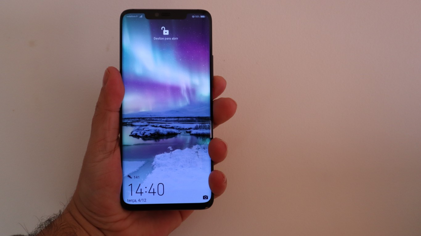 O “notch” é bem maior que o instalado no P20 Pro, mas incorpora os sensores imprescindíveis para o destravamento facial por 3D, luminosidade e uma super câmara frontal. Podemos, por cortesia, optar por esconder o “notch” através de uma barra preta horizontal, mas perde-se um pouco de ecrã.