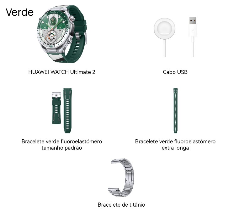 A apresentação do Huawei Watch Ultimate 2 Green Edition está à altura do preço. A embalagem não é uma caixa de cartão com espuma, é toda uma experiência de unboxing com materiais, estrutura e acabamentos que comunicam a mesma linguagem premium do produto. Quem já comprou relógios de relojoaria tradicional vai reconhecer a lógica: a caixa faz parte do produto, não é apenas protecção de transporte.