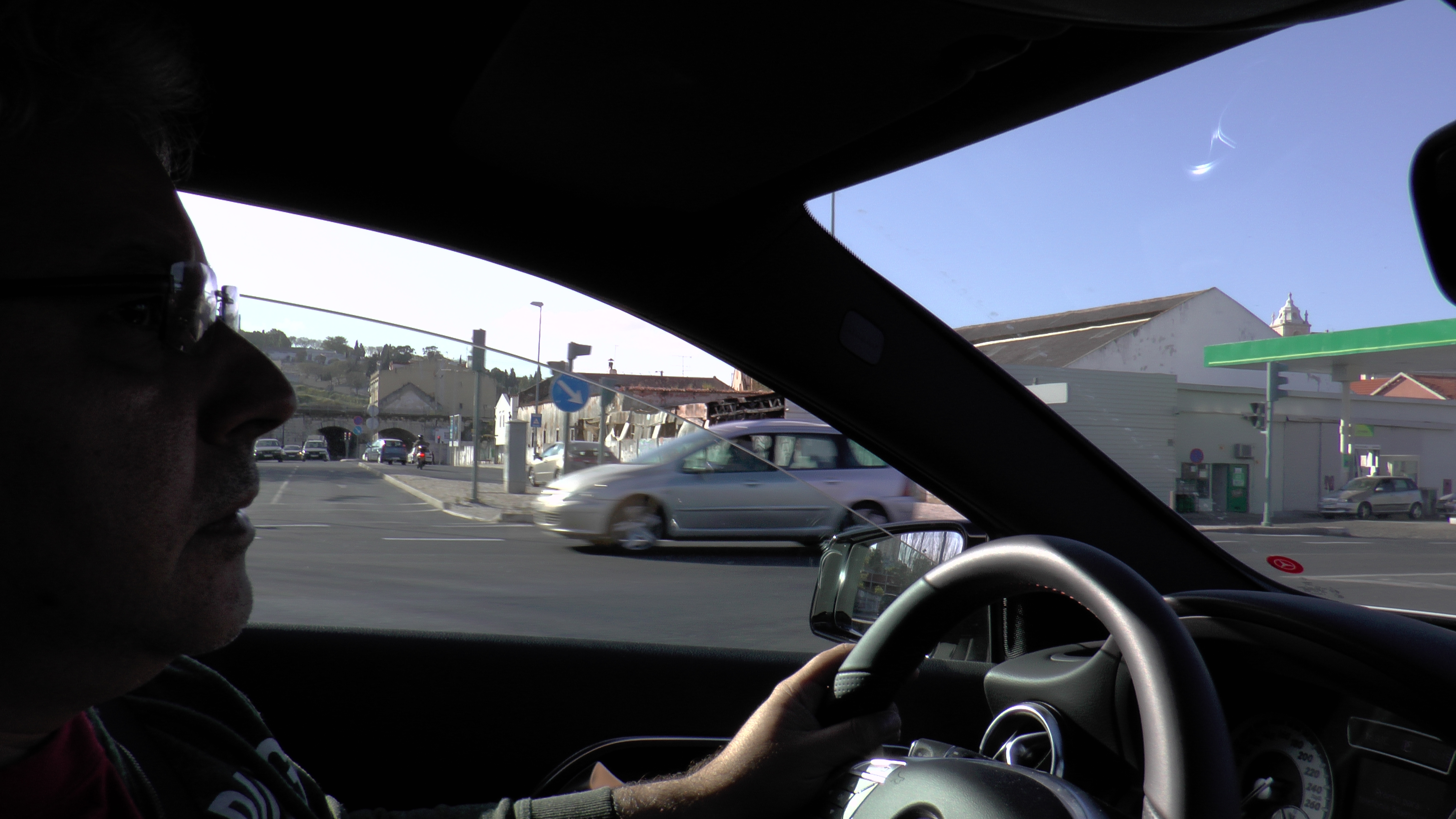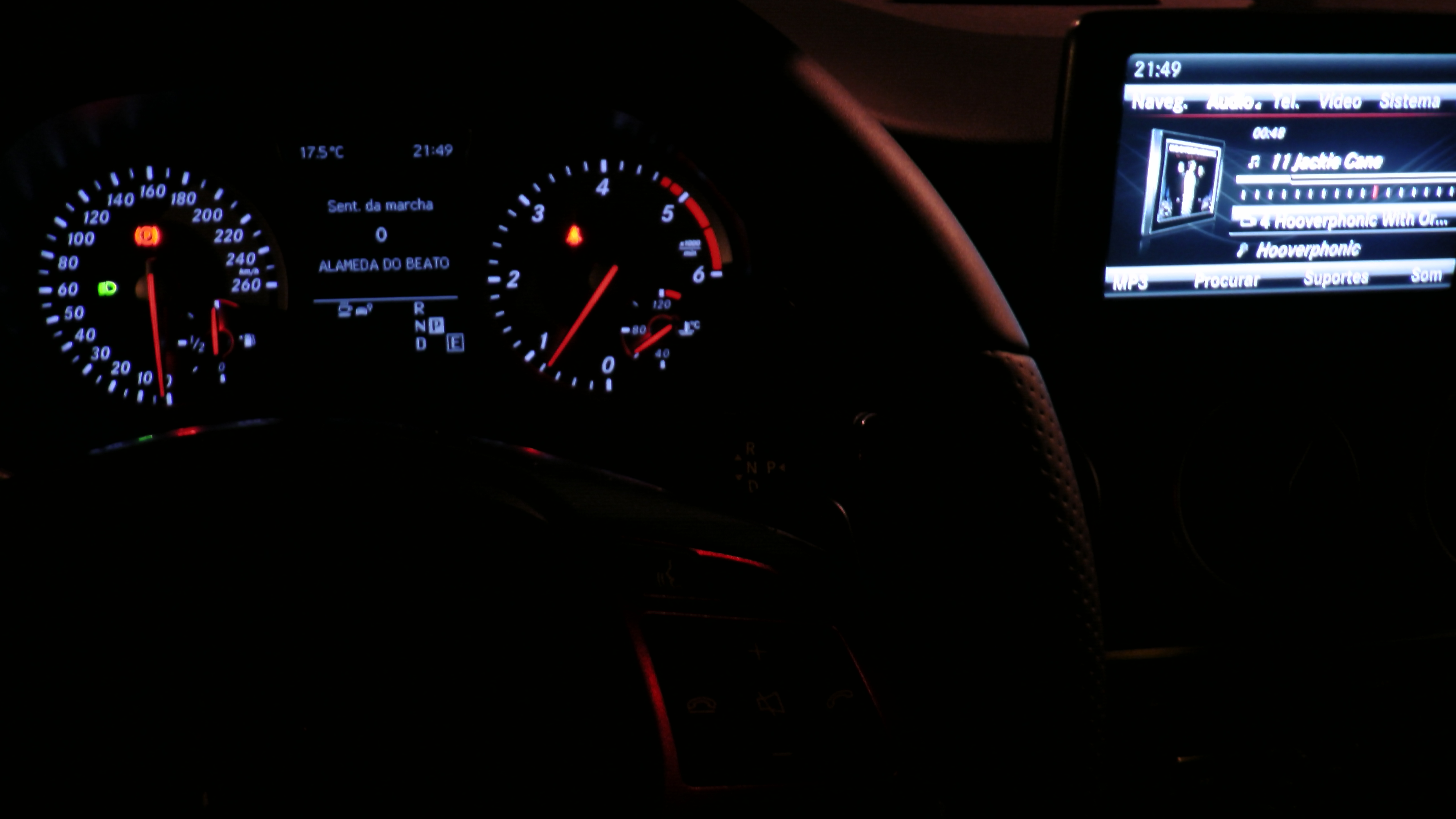 Perdi mesmo algum tempo dentro do carro antes de iniciar a marcha. Primeiro, porque a Mercedes tem o travão de mão eléctrico e por baixo à esquerda do volante que convém destravar mas com o pé no pedal do travão. Segundo porque, automático, há sempre uma diferença para colocar a primeira marcha em relação a outros engenhos similares. Terceiro, são tantas as manetes que tive de me certificar que tudo estava em automático (sensores, iluminação, etc.). Quarto, como funciona o ecrã que não é táctil? Ah, através da roda de comando que, só depois de algum tempo, é que percebi que também, para além de um ‘click Enter‘ para baixo, também tem outro click para trás e esse é que nos faz movimentar e selecionar os muito parâmetros do sistema multimédia.