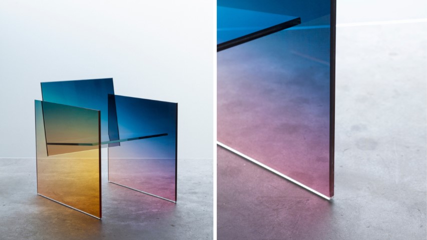 Esta gama, que inclui um espelho púrpura, uma prateleira azul, uma mesa verde e a cadeira que reflete, baralha e torna a dar as cores dependendo da iluminação exterior, apresentando pigmentos de cores fortes que desaparecem para clarear.