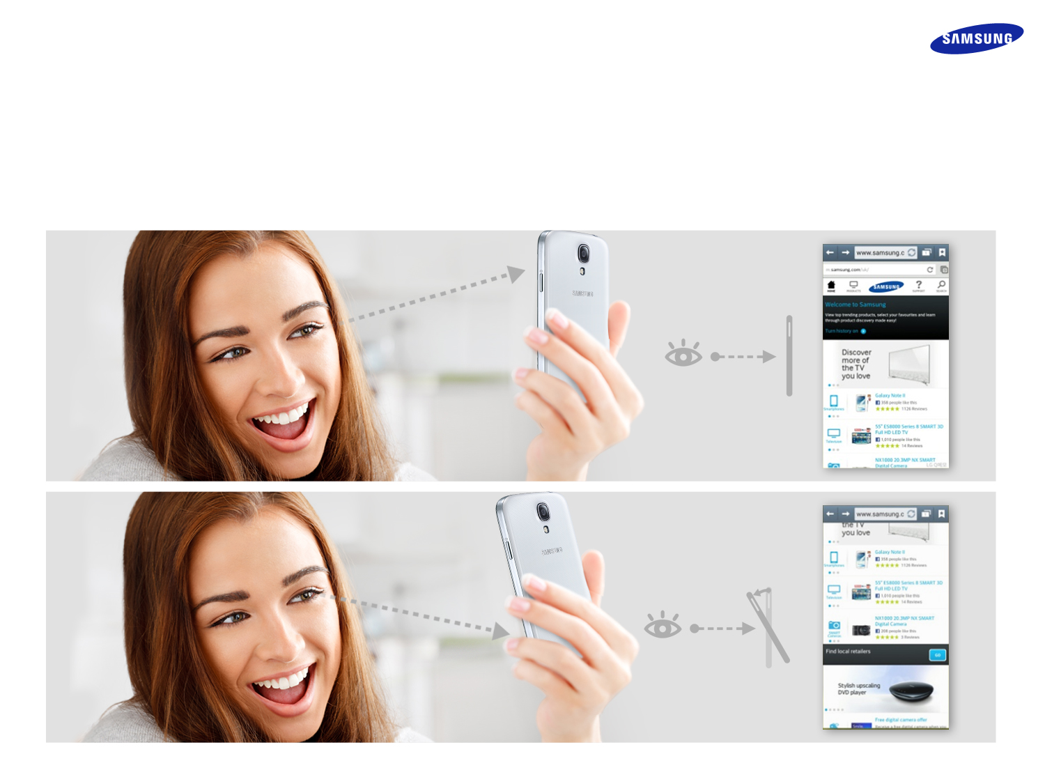 Para começar, os dois sensores colocados perto da câmara frontal são usados para reconhecer os gestos e a proximidade do utilizador. O sensor de gestos reconhece os movimentos das mãos, detetando os raios de infravermelhos que são refletidos na palma na mão do utilizador. Este sensor foi aplicado na função Air Gesture do GALAXY S4, que permite que os utilizadores aceitem chamadas telefónicas, mudem de música ou naveguem numa página web apenas recorrendo a movimentos da mão.
