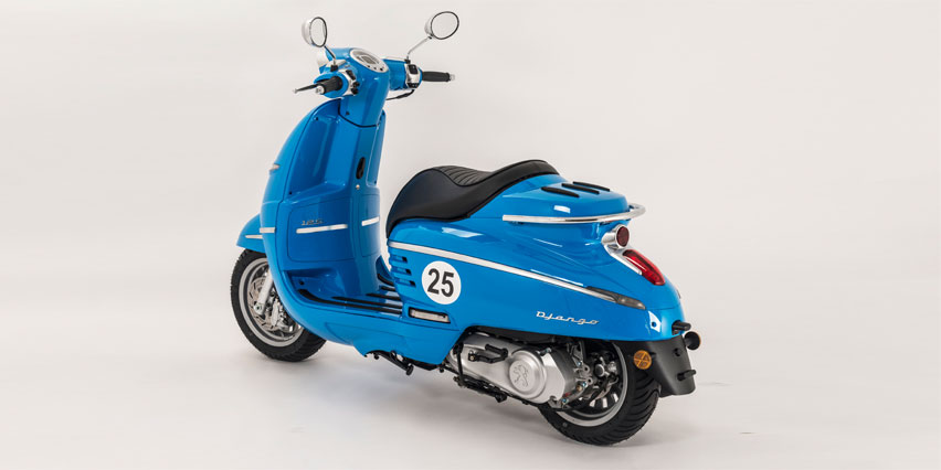 Nos anos 50 do século (e milénio) passados, a Peugeot lançava a scooter S55 que foi um sucesso de vendas e achou por bem que tinha chegado a hora de reinterpretá-la, num mercado europeu em permanente adoração por linhas clássicas com ambiente sofisticado e moderno.Temos então a nova Django, uma scooter com motorizações de 50cc a 2T e 4T, bem como 125 e 150 a 4T.