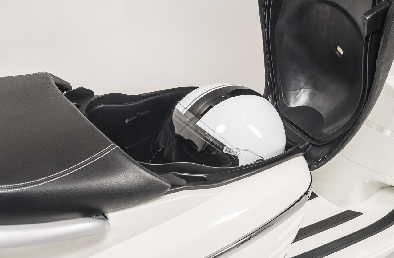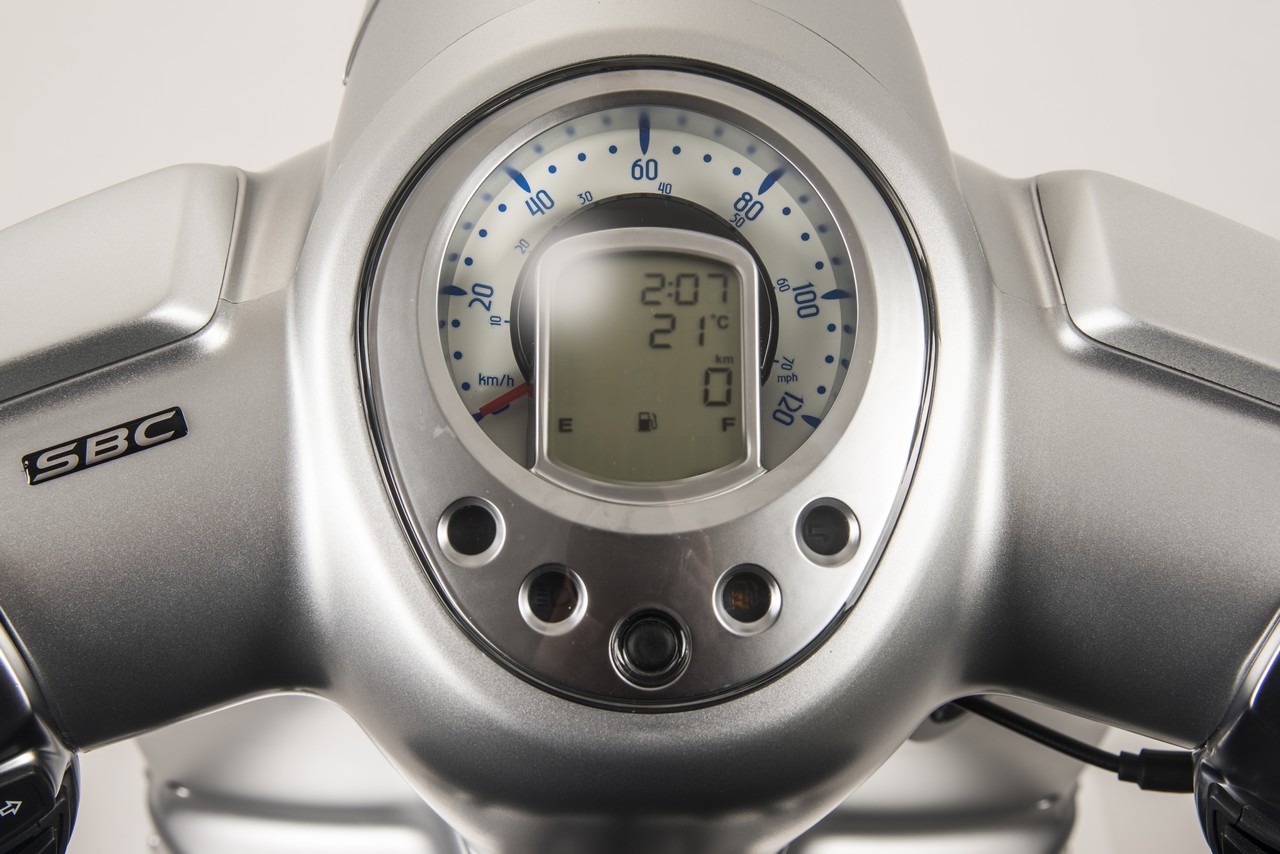 O design retro não esconde a última tecnologia, mas os nossos olhos (pelo menos os meus) ficam a admirar as linhas suaves e equilibradas, o espaço para um capacete e algo mais, a leitura legível da informação, as jantes de 20″, travagem combinada e iluminação Led.