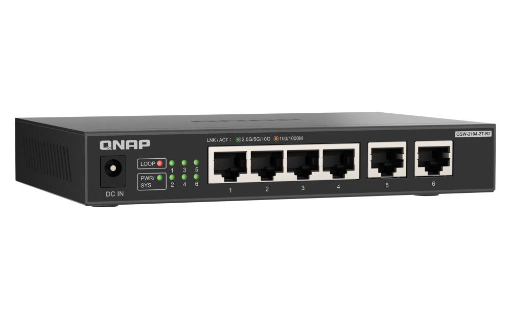 A QNAP Systems, Inc., inovador líder em soluções de computação, rede e armazenamento, lançou o novo switch não gerido de 4 portas 2.5GbE e 2 portas 10GbE Multi-Gigabit (total de 6 portas) QSW-2104-2T-R2.