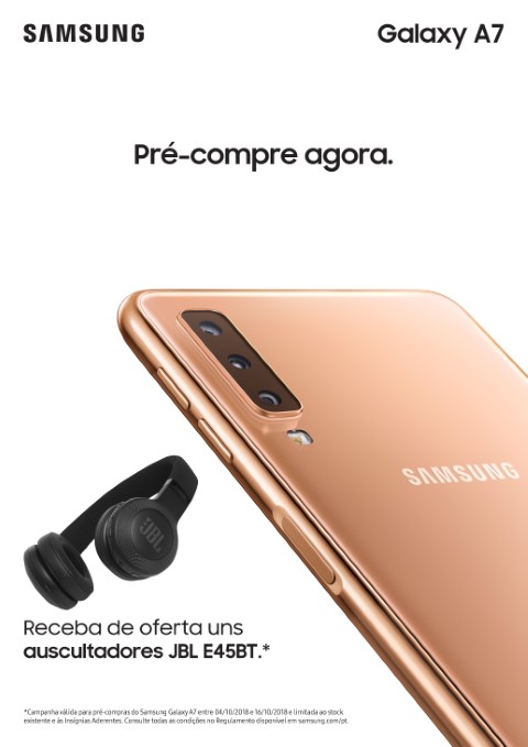 Com um design elegante e construção elegante, há também um belo presente quem comprar o novo Samsung Galaxy A7 até 16 de Outubro : uns auscultadores sem fio JBL E45BT.