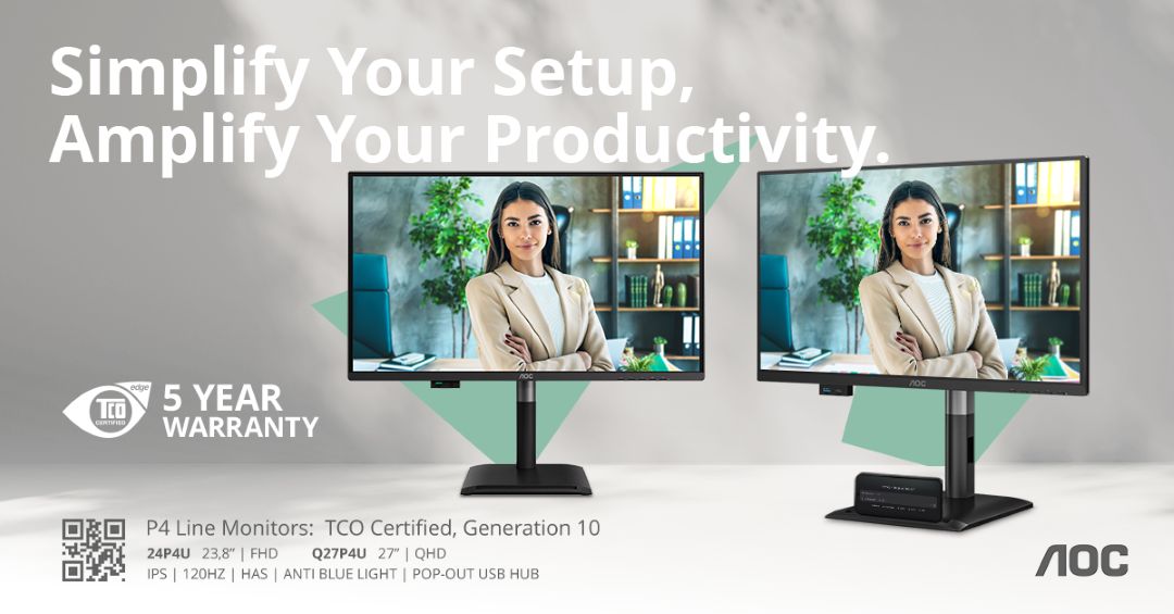 A série AOC P4 recebeu certificação TCO de 10ª geração e Energy Star 8, reforçando o compromisso ambiental da marca. A garantia de 5 anos contribui para prolongar o ciclo de vida dos produtos, reduzindo desperdício electrónico e oferecendo confiança adicional às empresas que investem em soluções duradouras.