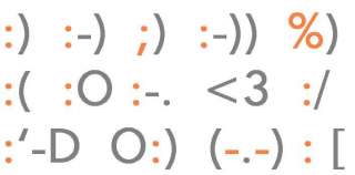 | ♥ | ☺ | ♬ | ☻ | ☹ | ✉ | ☼ | ✩ | ♨ | ♫ | ☁ | ☂ | ☃ | ☎ | ✔ |